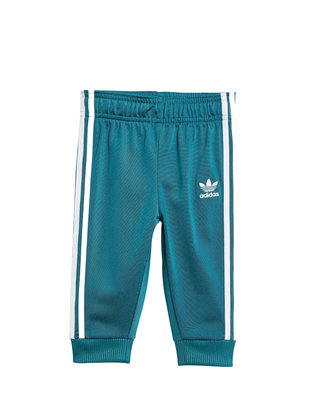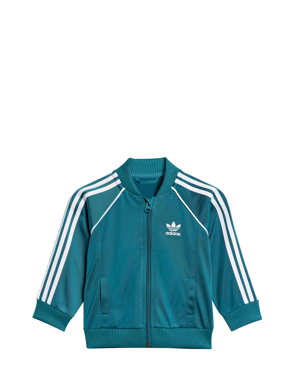 Il coordinato unisex per bambini Adidas in verde petrolio è composto da una tuta completa con dettagli distintivi dell'iconico marchio Adidas. La felpa presenta un colletto, chiusura a zip centrale, tasche laterali con zip e le riconoscibili 3 strisce sui lati. I pantaloni hanno una banda elastica regolabile in vita, tasche laterali e le iconiche 3 strisce lungo le gambe, con il logo del brand ricamato a contrasto. Un outfit sportivo e alla moda per i più piccoli.