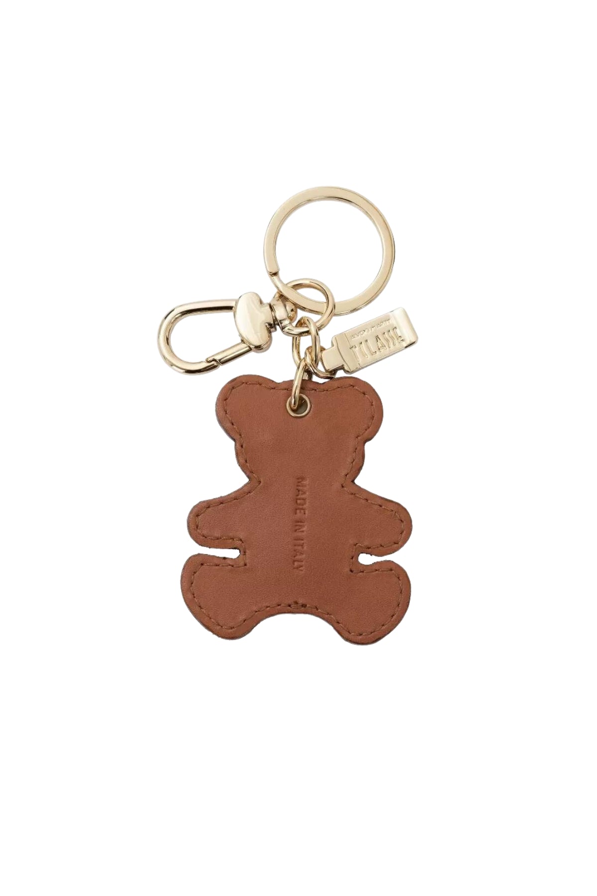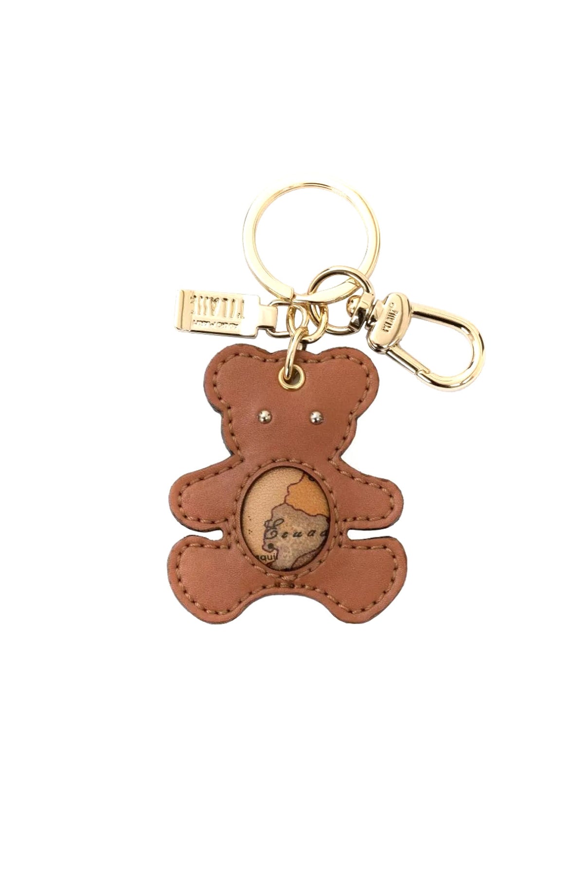 Portachiavi realizzato in pelle a forma di orsetto, con un dettaglio frontale in tessuto Geo classic.