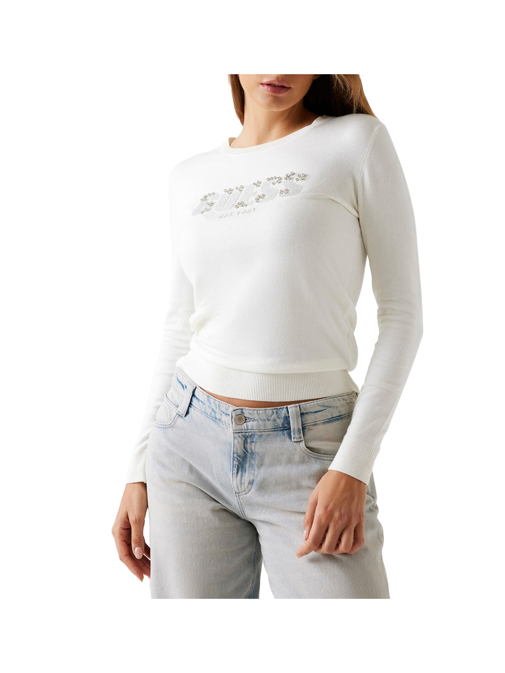Il maglione Guess Reyna è l'emblema dell'eleganza casual. Realizzato in viscosa elasticizzata, presenta un logo oversize e strass che conferiscono un tocco moderno. Perfetto per occasioni informali o serali, grazie al girocollo e all'orlo a coste che assicurano comfort in ogni situazione. Maniche lunghe e dettagli accurati completano il look raffinato di questo capo.