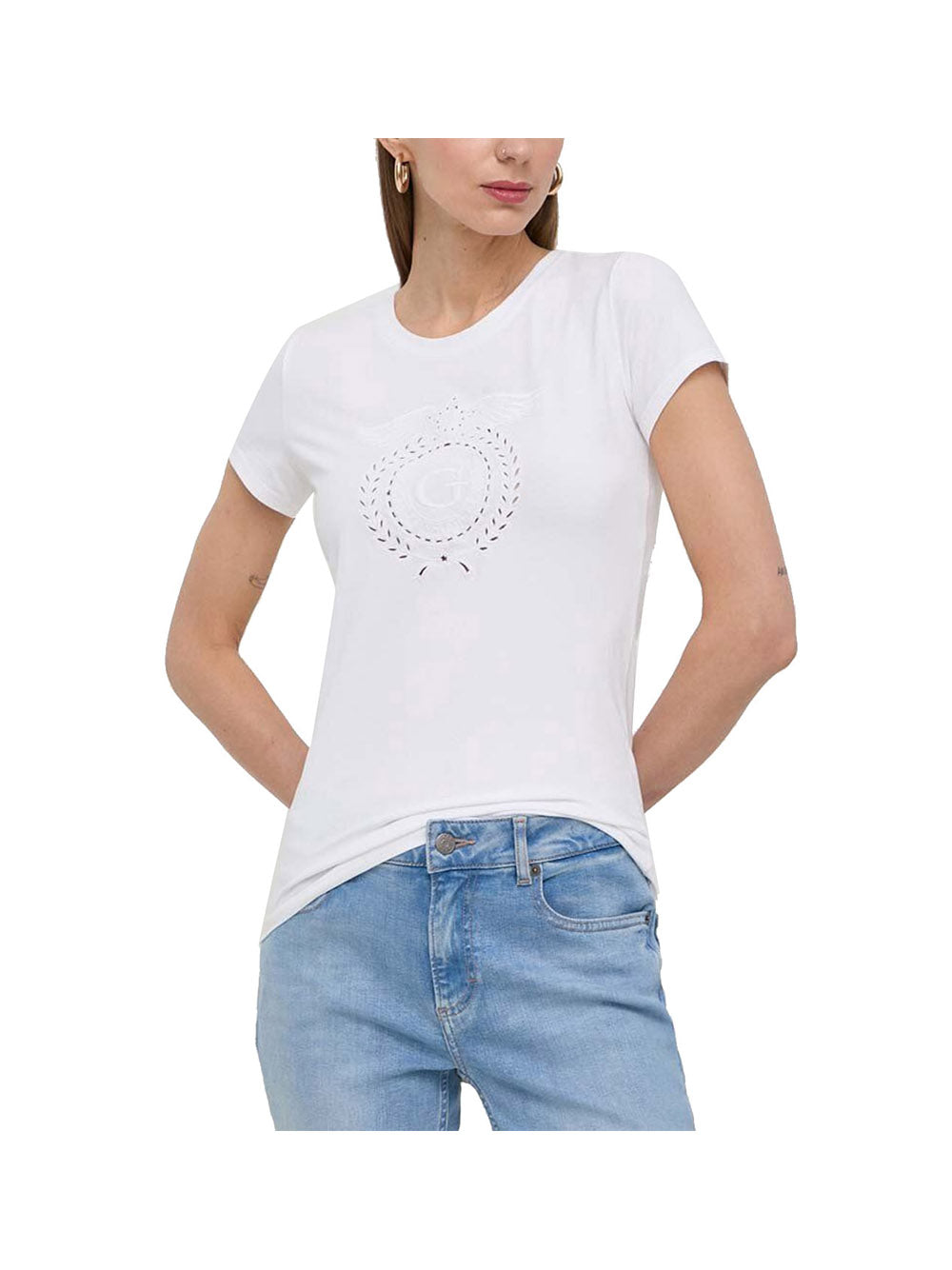 La T-shirt da donna bianca di Guess è un capo versatile e sofisticato che si adatta a ogni occasione. Realizzata in morbido cotone, presenta una stampa frontale con il logo del marchio per un tocco di eleganza. Perfetta da indossare con jeans o pantaloni per un look casual e alla moda.