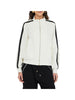 La felpa bianca Liu Jo è realizzata in morbido interlock di cotone stretch, con bande laterali a contrasto decorate con pizzo. Il design presenta un collo alto, tasche sui lati e logo in metallo. Dotata di chiusura con zip logata, è composta principalmente da cotone ed elastan, con dettagli in poliammide e viscosa. Un capo elegante e femminile, perfetto per un look casual-chic.